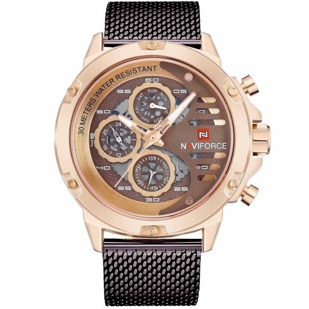 ساعت مچی مردانه Naviforce مدل 9110 با طراحی مدرن و ترکیب رنگ رزگلد و مشکی، انتخابی شیک برای آقایانی است که به استایل رسمی و اسپرت اهمیت می‌دهند. بدنه فلزی مقاوم، بند استیل حصیری با قفل محکم و شیشه معدنی ضدخش، دوام و کیفیت بالای این ساعت را تضمین می‌کند. این مدل علاوه بر نمایش دقیق زمان، دارای نمایشگر روز و تاریخ بوده و با موتور کوارتز ژاپنی عملکردی دقیق و قابل اعتماد ارائه می‌دهد. طراحی خاص صفحه و ترکیب رنگ جذاب، آن را به گزینه‌ای مناسب برای استفاده روزمره و همچنین مهمانی‌ها تبدیل کرده است.